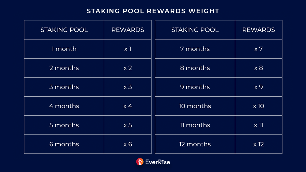 Staking with EverRise is a commitment from one holder to other RISE holders that they will not contribute to selling pressure. For this commitment, the staking holder receives rewards commensurate with the time period of that commitment.